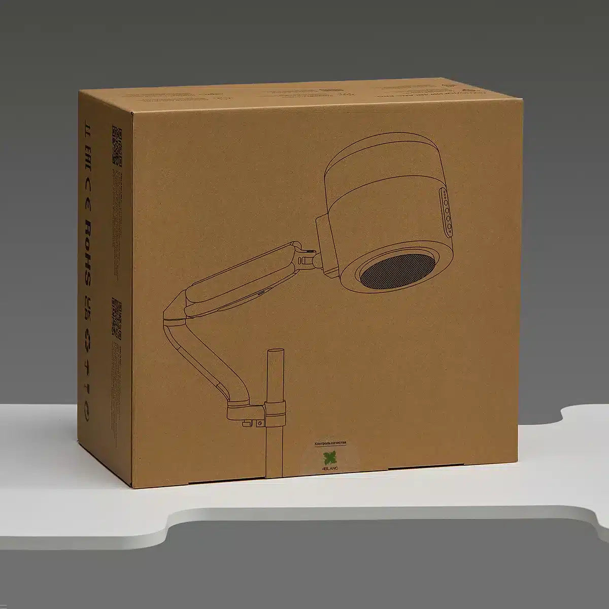 Embalaje: cajas de cartón y alojamientos formados con papel 100 % reciclado (52 x 46 x 29 cm), impresión monocromática; Manual digital solo con enlaces de código QR en la caja (para descargar desde el sitio web).