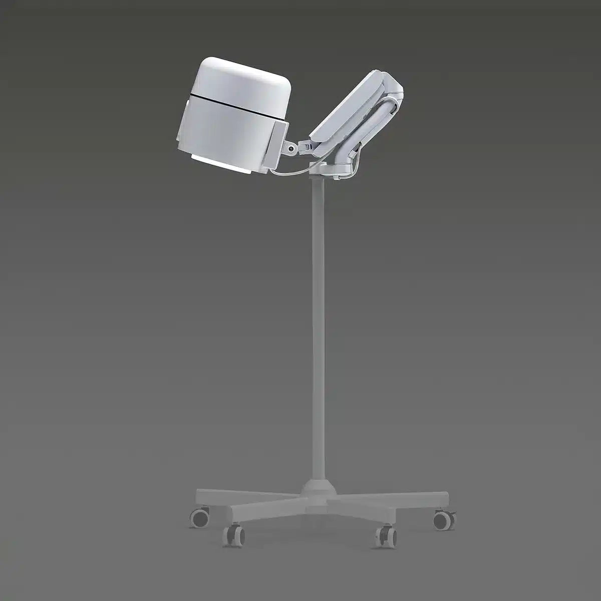 Diseño: Cuerpo ergonómico cilíndrico enfocado a un funcionamiento intuitivo/simple; controles en el cuerpo (considerando operar manualmente con guantes), fácil posicionamiento en el brazo articulado de contrapeso para un cómodo ajuste del ángulo para una mejor succión y luz, sistema de montaje en mesa requerido solo 10 cm² al costado del espacio de trabajo (estación de manicura), montaje opcional en soporte rodante para moverse (estación de pedicura)