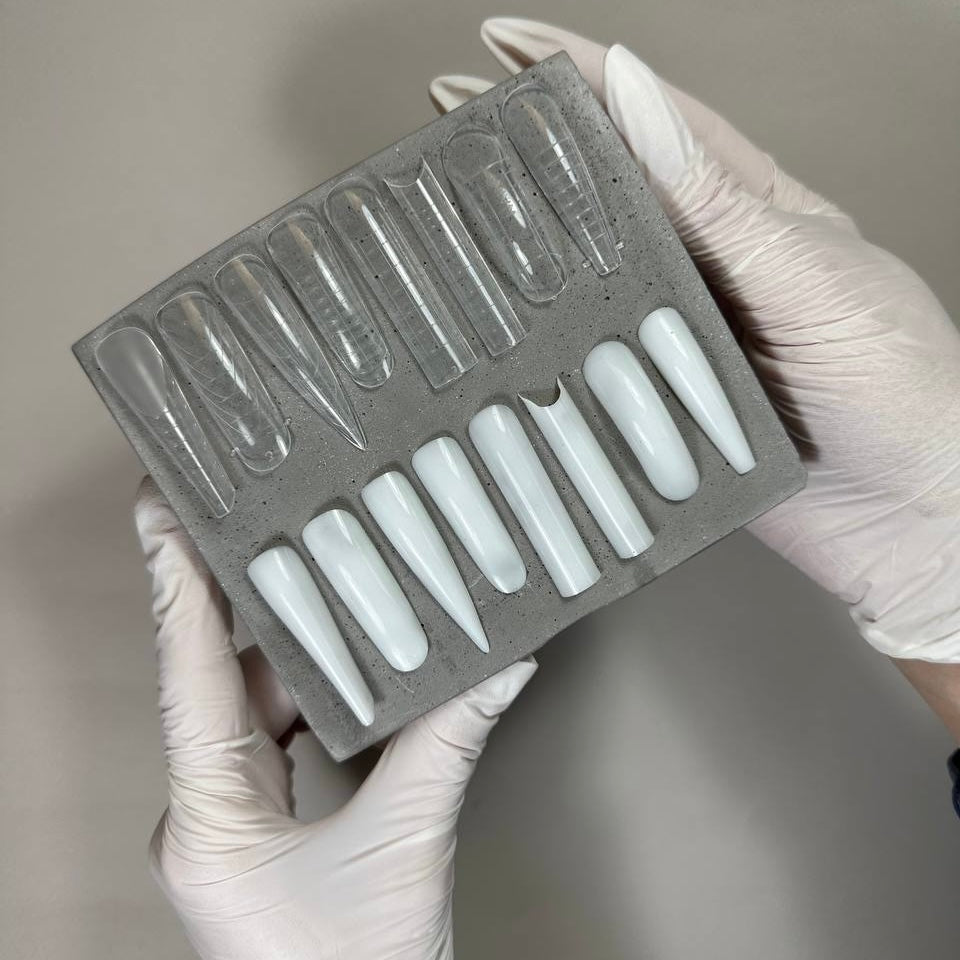 Tecnología de uso: desengrasar la placa ungueal;aplicar deshidratador NAILSOFTHEDAY DESHIDRATADOR ;luego NAILSOFTHEDAY ULTRABOND;hacer una capa elástica de la base con Builder base gel fuerte, SCOTCH BASE o base de Goma con una capa fina y frotando, luego polimerizar.Elegimos las puntas del tamaño requerido para la placa ungueal, y en su lado interno aplicamos el material seleccionado para modelar, recomendamos aplicar NAILSOFTHEDAY gel constructor Camuflaje, gel Smart Jelly, gel constructor Ariel, gel constructor Shell o gel Builder Flower/Potal.Lo fijamos en la placa de la uña con la ayuda de una lámpara de uñas o pinza NAILSOFTHEDAY.Polimerizamos en una lámpara híbrida de 36/48 W durante 1-2 minutos (según material seleccionado, largo y espesor).Después de la polimerización completa del material, retire las puntas, pellizcando ligeramente desde los lados para una extracción rápida.Ajuste la forma con una sierra y un cortador de carburo, así como con aserrín debajo de la uña.Retire los restos de dispersión y polvo de la uña terminada con un líquido especial NAILSOFTHEDAY Nail Prep.Recomendamos cubrirlo con una tapa sin estrés que no se puede limpiar.Polimerización: UV – 120 segundos, LED – 60 segundos.