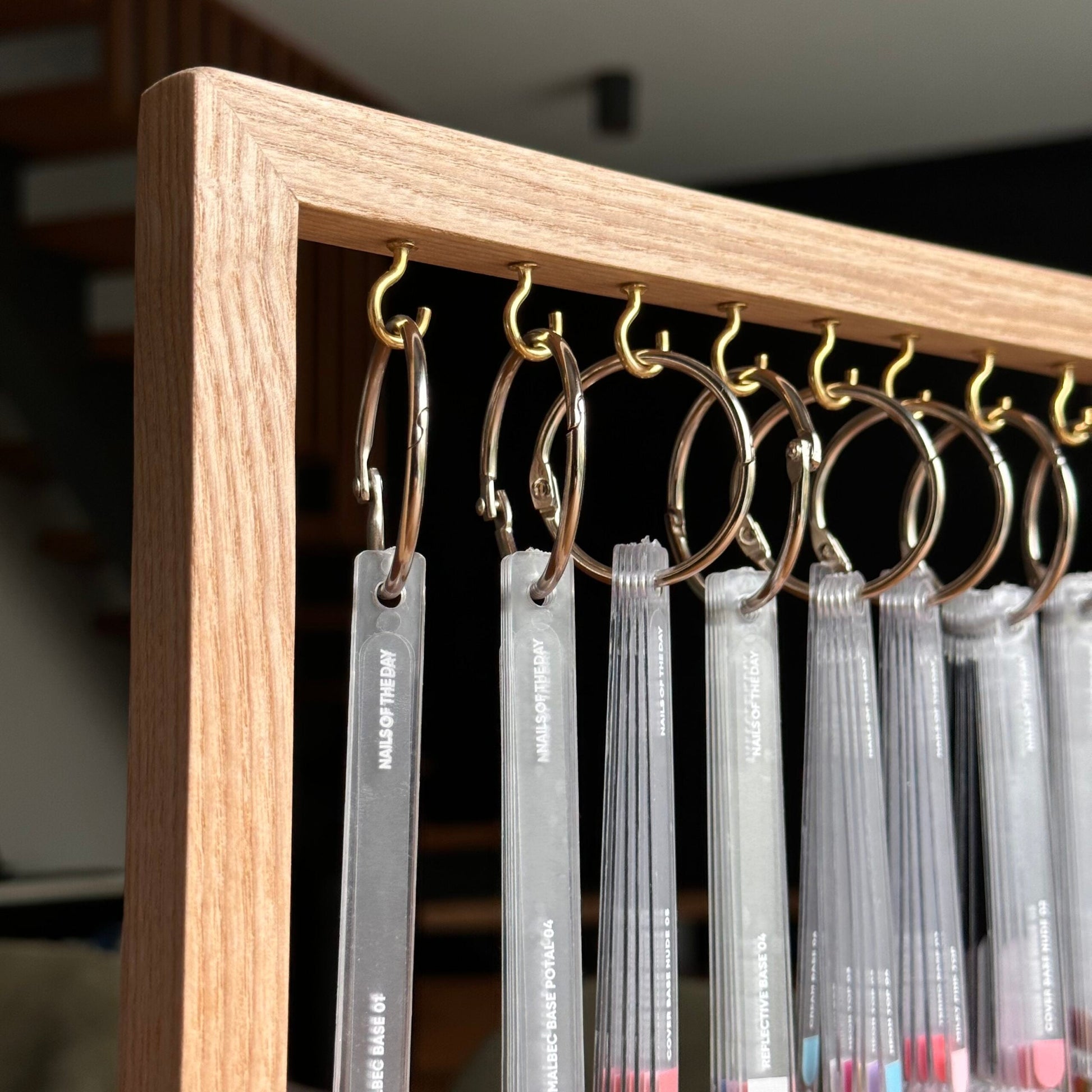 Los anillos cuelgan paralelos, no interfieren entre sí y se pueden quitar cómodamente con cualquier número de puntas.